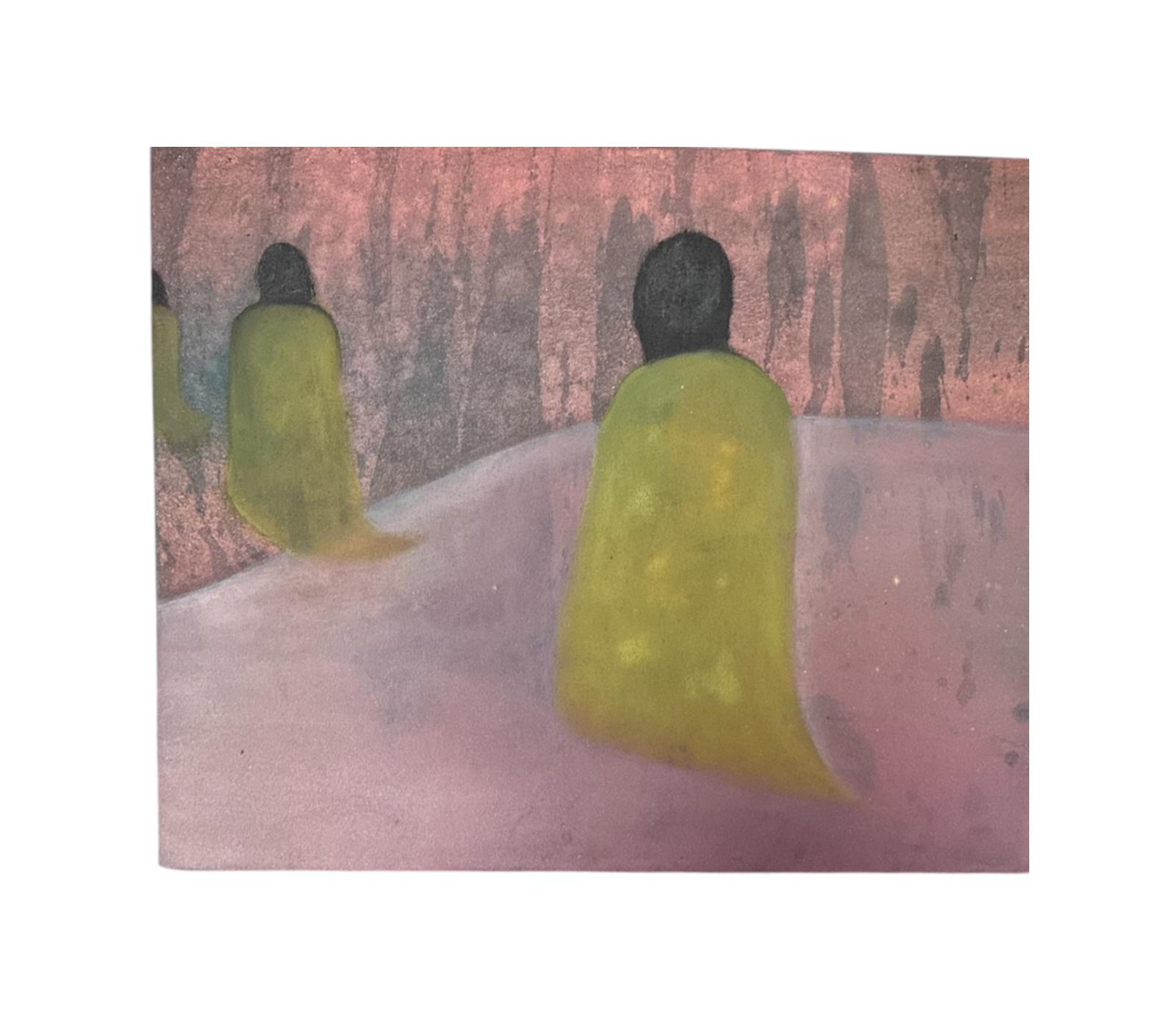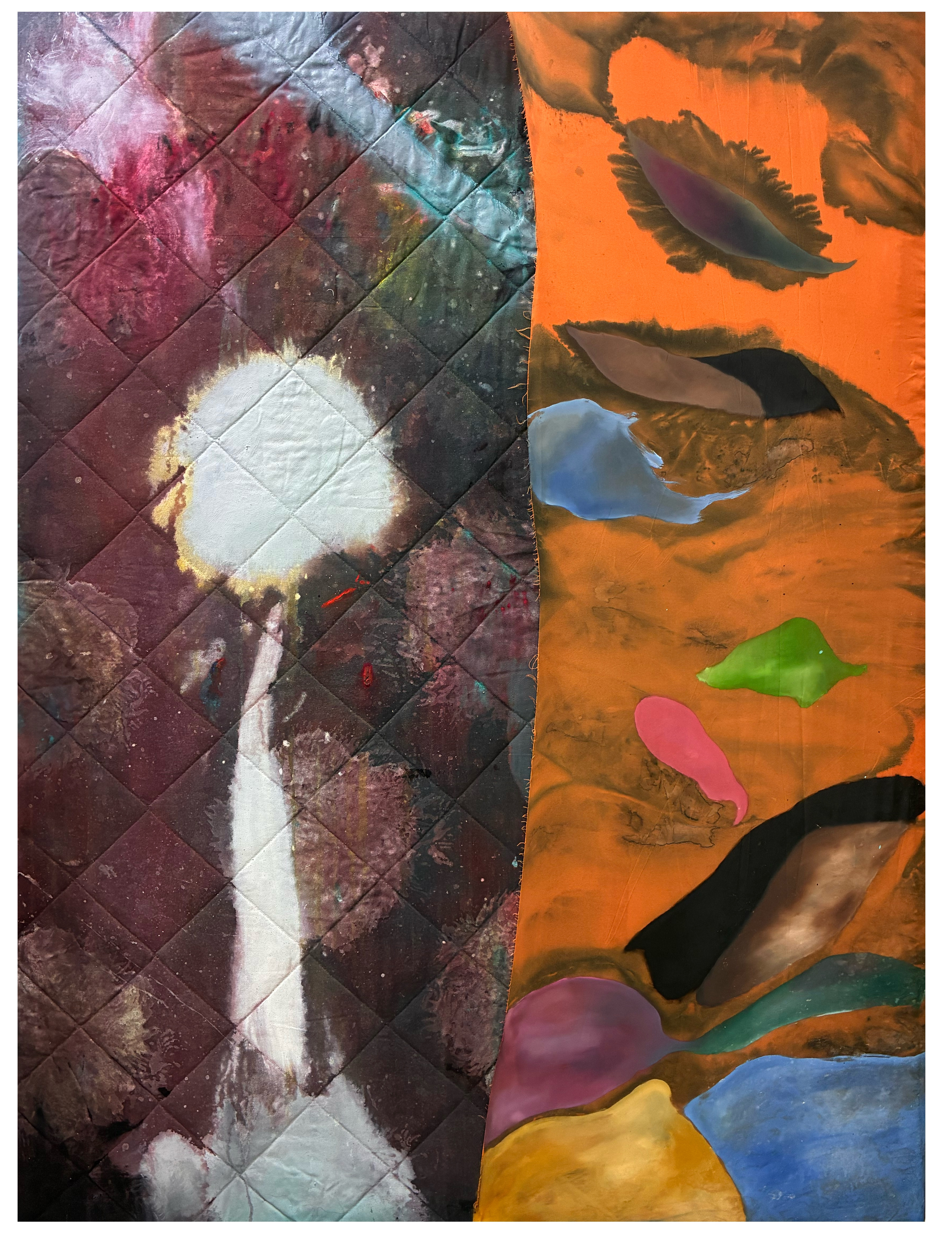Las figuras que habitan la obra de Kiván Quiñones Beltrán podrían transmutarse en muchos personajes: una presencia ancestral, una referencia a la pintura haitiana o una encarnación del tan elusivo duende de Federico García Lorca, asomándose a la posesión. Sus seres transitan entre estados liminales, entre medios como la pintura y la instalación. El espacio de la galería se centra en la cama deshecha y vivida, la cual es a su vez un portal entre el sueño y la vigilia, el inconsciente y el consciente. Es también el locus del principio y del fin de la vida y de los estados de conciencia.
